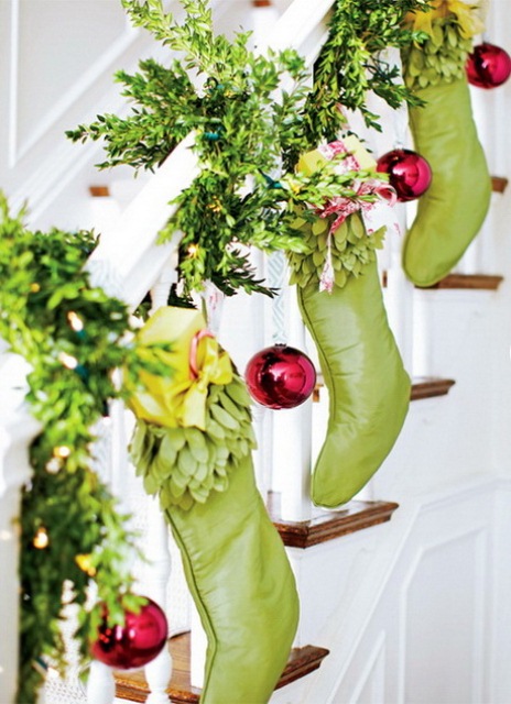 - Decorate i pilastrini delle sclale con i fiocchi di Natale, corone natalizie o rampi di sempreverde con addobbi di Natale.